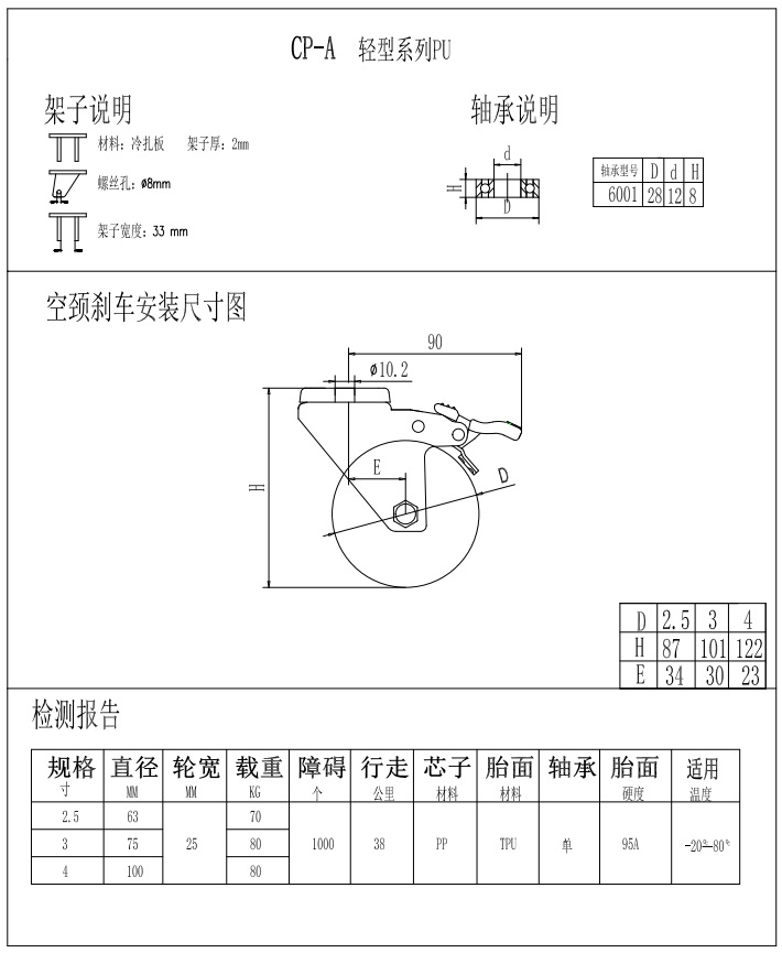 輕型腳輪-CP-A4-2561空頸剎車PU